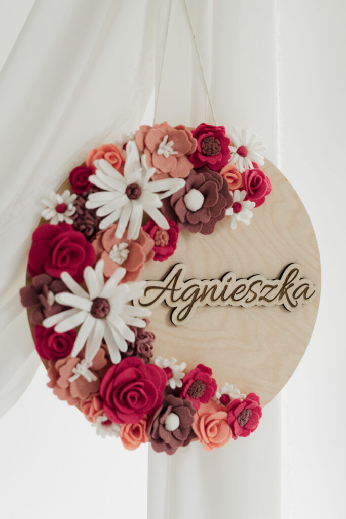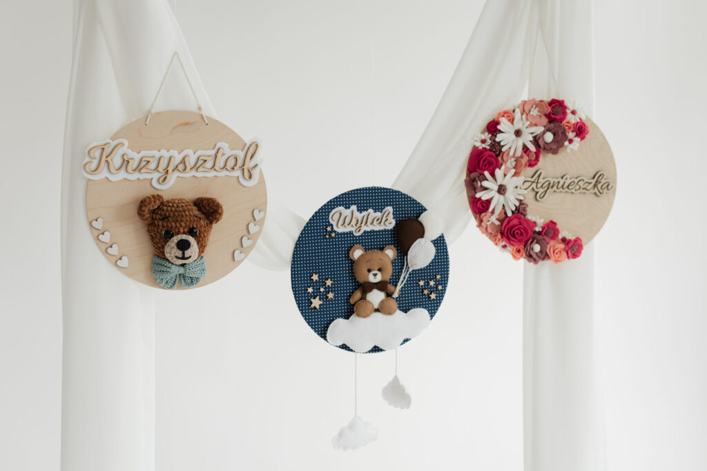 Osobisty akcent, który dodaje wnętrzu wyjątkowego charakteru. Idealne jako dekoracja na ścianę lub drzwi. Zawieszki z imionami tworzę w dwóch wersjach: elementy mogą być szydełkowe lub szyte z filcu/tkaniny.